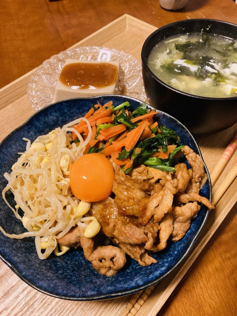 夕飯はせめて食べたいものを食べようと、献立予定を変更してビビンバ風丼を作った。牛肉はなかったので豚肉で。私はインドで生活していた頃の影響なのか、今や牛肉にあまり魅力を感じなくなっていて、ステーキやすき焼きはまた別だけど普段食べるなら牛肉より豚肉を好んでいる。(実はインドでもチベットや北東系の店に行けば豚肉を食べられる)